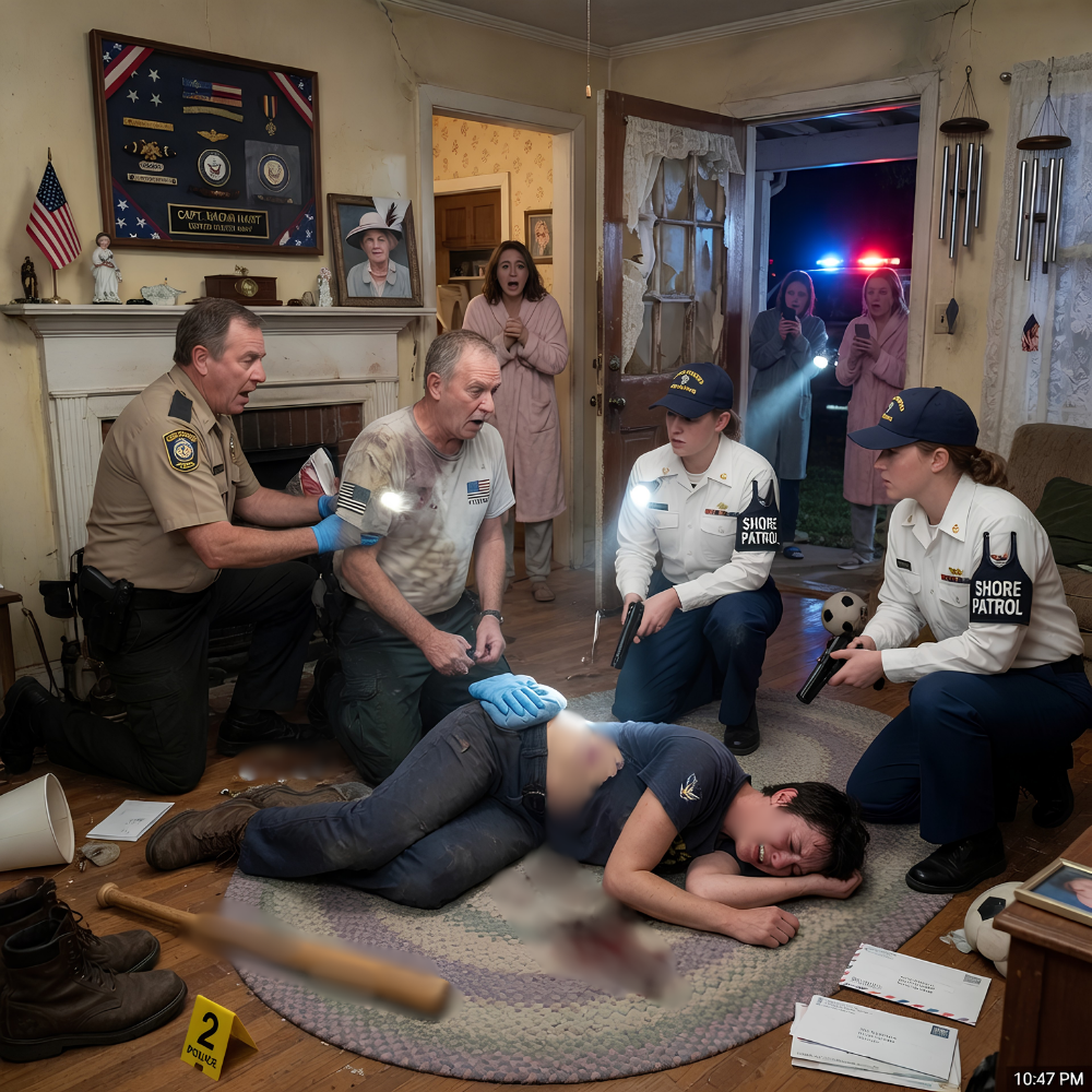 Mom’s hand flew to her mouth. My sister’s jaw dropped. Dad stopped struggling against the cuffs and stared at the sailor, then at me, then at the shadow box above Grandma’s mantle—the one with my ribbons and insignia pinned neatly inside.